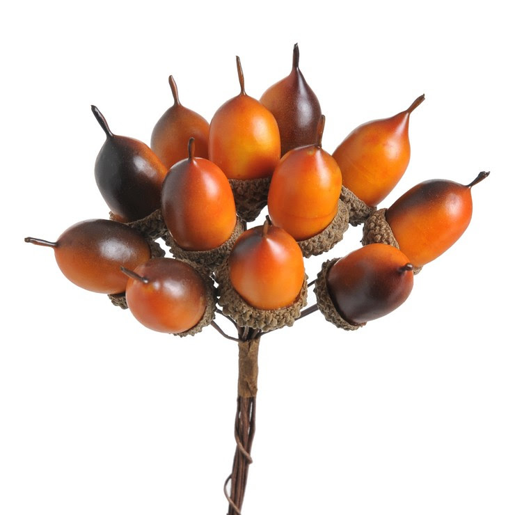 Svazek umělých žaludů využijete především pro podzimní dekorování. Žaludy jsou vyrobené z plastu, ale nerozeznáte je od živých. Jsou nádherně zpracované a věrohodně vybarvené. Čepičky žaludů jsou pravé, přírodní. Samotný žalud je vybarvený do hnědých odstínů. Svazeček je tvořen celkem 12 ks žaludů, každý je připevněná k ohebnému drátku. Svazek můžete používat v celku nebo jej rozdělit na jednotlivé žaludy a ty použít k dalšímu dekorování. Pomocí tavné pistole je připevníte k věnci nebo je jednoduše omotejte, kam jen budete chtít.